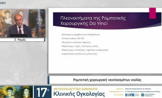 Βίντεο της ομιλίας μου στο 17ο Μετεκπαιδευτικό Σεμινάριο Κλινικής Ογκολογίας, με θέμα: Η Ρομποτική χειρουργική στα νεοπλάσματα κοιλίας, στα πλαίσια debate σχετικά με την ανοιχτή και Ρομποτική χειρουργική στην αντιμετώπιση νεοπλασμάτων κοιλίας. Διεξήχθη την 1η Νοεμβρίου 2025 , στο Ξενοδοχείο Monasty, Θεσσαλονίκη. Το πλήρες βίντεο της ομιλίας μου :